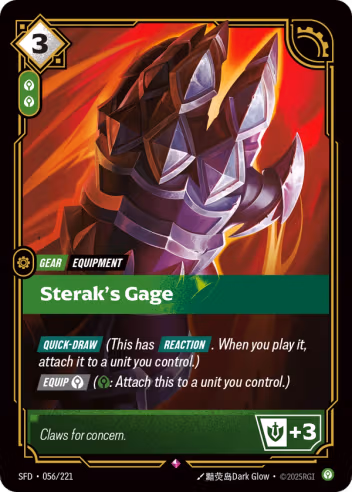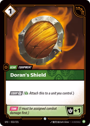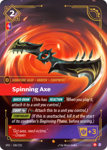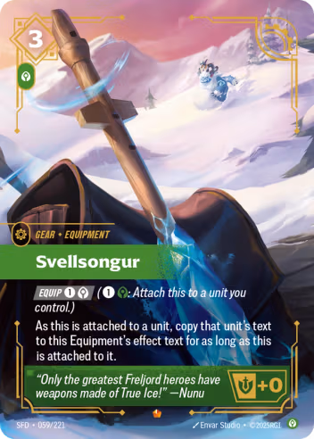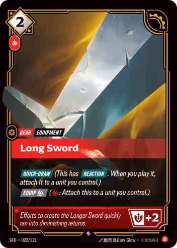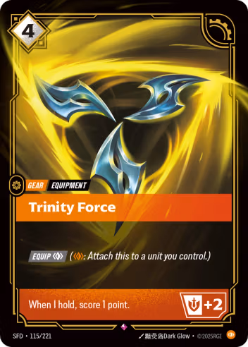 Spiritforged wprowadza nowy rodzaj gearów – Equipmenty, czyli przedmioty, które możemy podpinać do naszych unitów. Każdy equipment posiada koszt zagrania, koszt podpięcia i efekt. Czasem to tylko pompka (np. +2 Might), czasem dodaje keywordy (np. Tank), a czasem efekty, takie jak „When I hold, I score 1 point”.