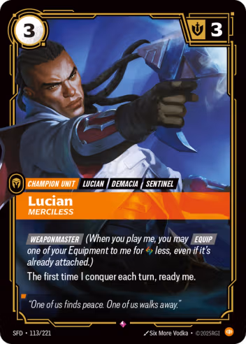 Lucian posiada keyword Weaponmaster, pozwalający po wejściu podpiąć do niego dowolny equipment. (Więcej informacji o keywordzie Weaponmaster znajdziecie na końcu tego artykułu.)
