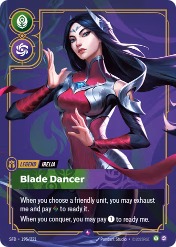 Dzięki pierwszej umiejętności Irelii możemy przygotować naszego unita (lub unita naszego partnera w wersji 2v2) jeśli zostanie on wybrany, tzn. jeśli stanie się celem spella lub umiejętności. By to zrobić, musimy tapnąć Irelię i zapłacić jeden Power (np. poprzez recycle dowolnej runy lub przez użycie Seala).