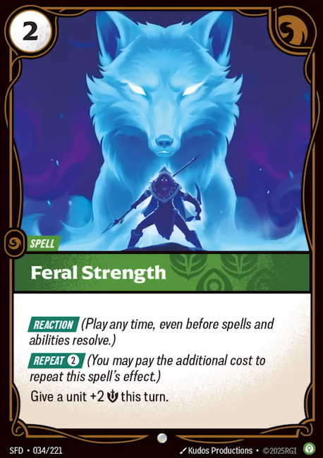 Repeat – kicker (dopłata), który pozwala zduplikować efekt zagrywanej karty. Przykładowo: Feral Strength zagrany za 2 da wybranej jednostce +2 Might, ale jeśli w momencie zagrania dopłacimy 2, jednostka dostanie +4 Might.